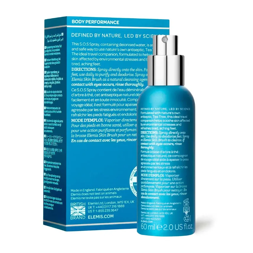 ELEMIS Sp@Home Tea Tree S.O.S. Spray, containing deionised therapeutic herbal water, is the easiest and safest way to use nature’s own antiseptic, Tea Tree. The ideal travel companion, it is a powerful solution for insect bites, cuts and grazes and to refresh tired, aching feet.