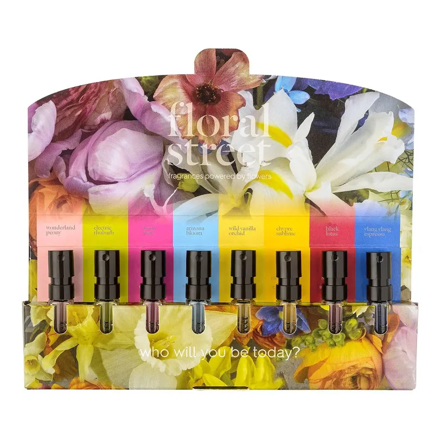 A mini scent wardrobe containing a 1.5ml sized spray bottle of eight vegan sustainable and unforgettable floral perfumes.