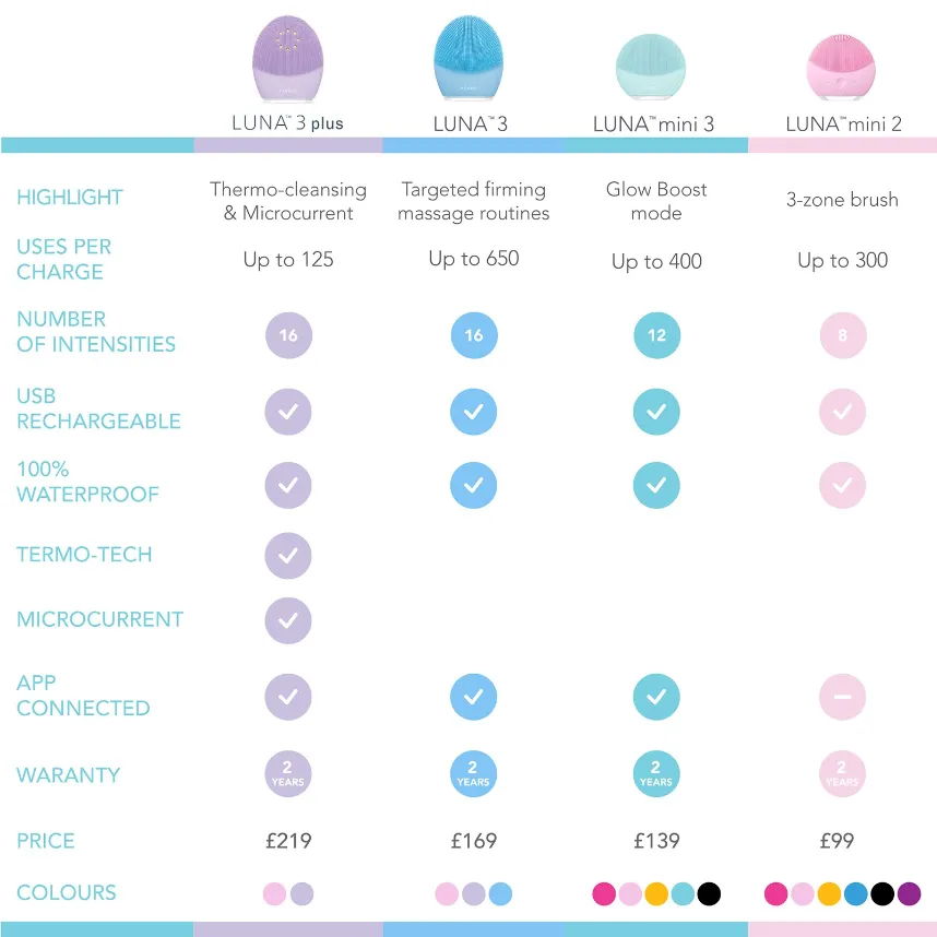 In addition to cleansing, LUNA 3 offers a variety of massage routines that target specific areas of your face. Available exclusively via the FOREO For You app, each massage tightens the skin for a refined, younger-looking complexion. LUNA 3’s upgraded design features silicone ridges shaped to glide easily over your face, neck and décolleté while low-frequency pulsations remove excess fluid to reduce puffiness and diminish signs of ageing.