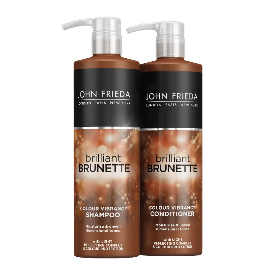 Discover John Frieda Brilliant Brunette Colour Protecting Moisturising Shampoo and Conditioner Duo Pack for Natural & Colour Treated Brunette Hair, this Colour Protecting Moisturising Shampoo & Conditioner protects and preserves brunette colour as it rehydrates and replenishes dry, colour-treated brunette hair.