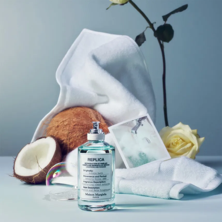 Bubble Bath Eau de Toilette, by Maison Margiela, captures a moment of bath time relaxation in a bottle. Sweet, soothing Soap Bubbles Accord and Coconut Milk evoke the cosy feeling of hot foamy water. Delicate floral notes of Lavender, Rose, and Jasmine are blended to create the comforting freshness of fluffy white towels.