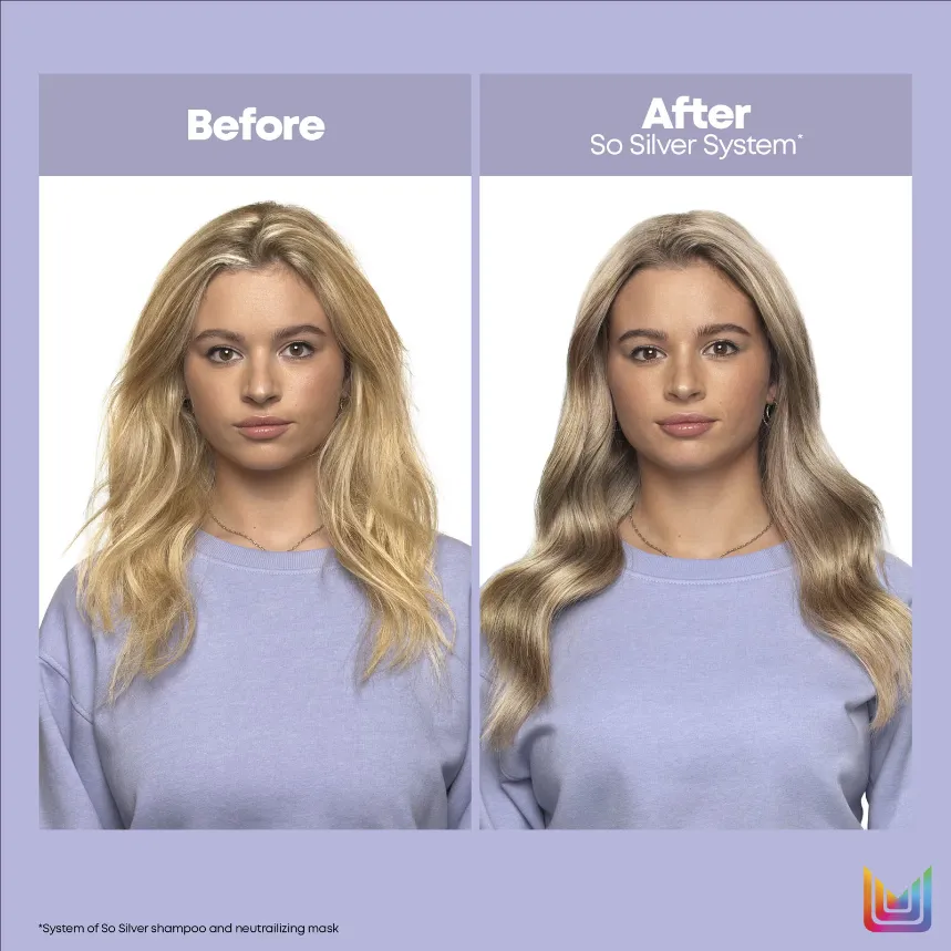 So Silver Color Obsessed Shampoo neutralises brassy warmth and corrects dull yellow tones on blonde, silver and grey hair types.