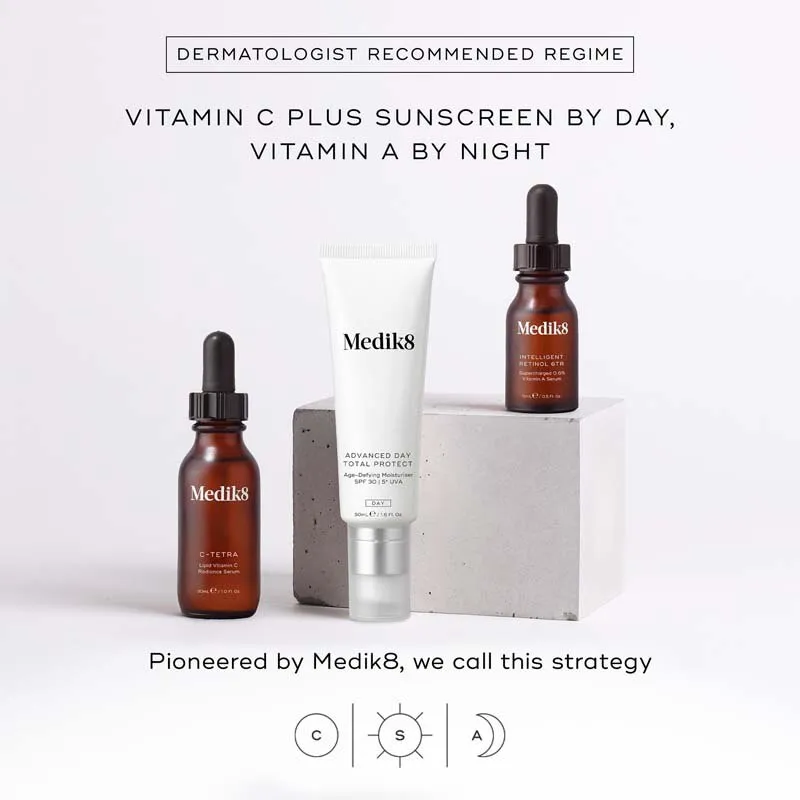 Medik8 recommend a simple, highly effective anti-ageing strategy of using vitamin C and sunscreen in the morning and vitamin A at night. This strategy is called: CSA.