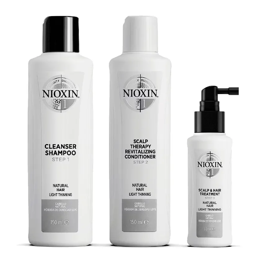 The volumising Nioxin 3-part System 1 treatment reduces hair loss due to breakage and strengthens the hair, while refreshing the scalp and delivering a healthy shine to natural hair with light thinning.