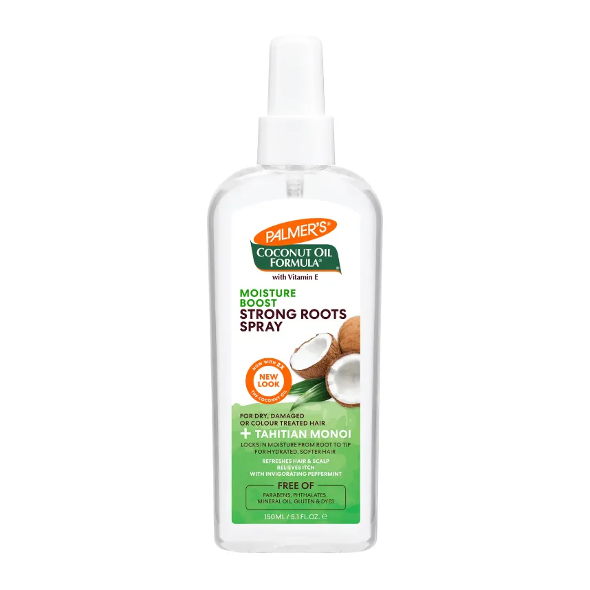 Palmer’s Coconut Oil Formula Strong Roots Spray contains fatty acids that quickly and deeply absorb into the hair strands, adding and sealing in moisture to keep hair shiny and manageable.