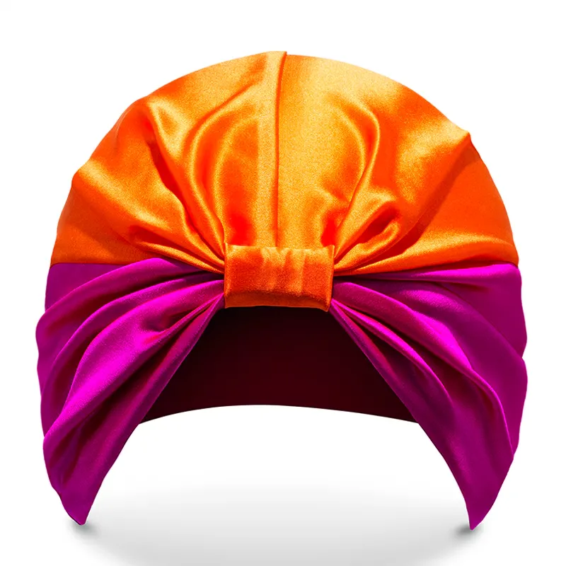 STEP 2: Be sure to tuck all your hair within your wrap so the elasticated silk edge is completely covering your hairline and the tip of your ears, this will ensure it sits tight, protecting and nourishing your locks all through the night.