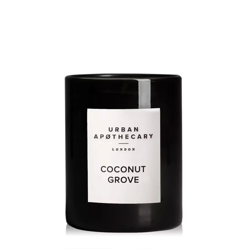 Urban Apothecary London Coconut Grove Luxury Candle – discover an aroma that’s joyfully addictive. Citrus notes of bergamot, lime and zesty mandarin, both deliciously sugary and tongue-tingling sour, are muddled with crushed coriander and mint. The heart is awash with tropical coconut, as if fallen fresh from the tree, then infused with lush palm leaf, jasmine and ylang ylang tones. Underneath, a twist of almond-like tonka with creamy sandalwood provides comforting caramelised warmth.