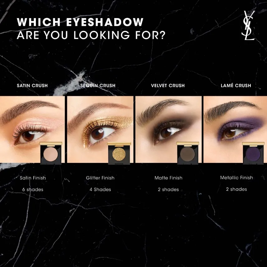 Introducing YSL Beauty Crush Matte Mono Eyeshadow in YSL signature Metallic & Velvet shades to create effortless, couture looks. Take your eyeshadow look to the next level with our highly pigmented, rich colour shadows for versatile & buildable eye looks, that blends effortlessly.